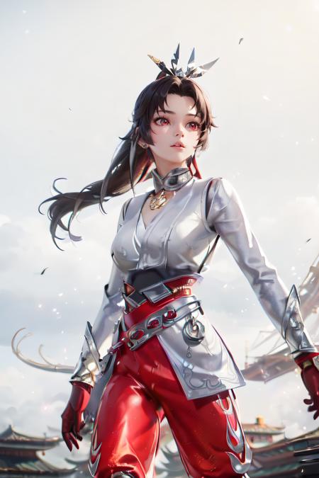 yunying in silver outfit, red pants, silver hair accessories,