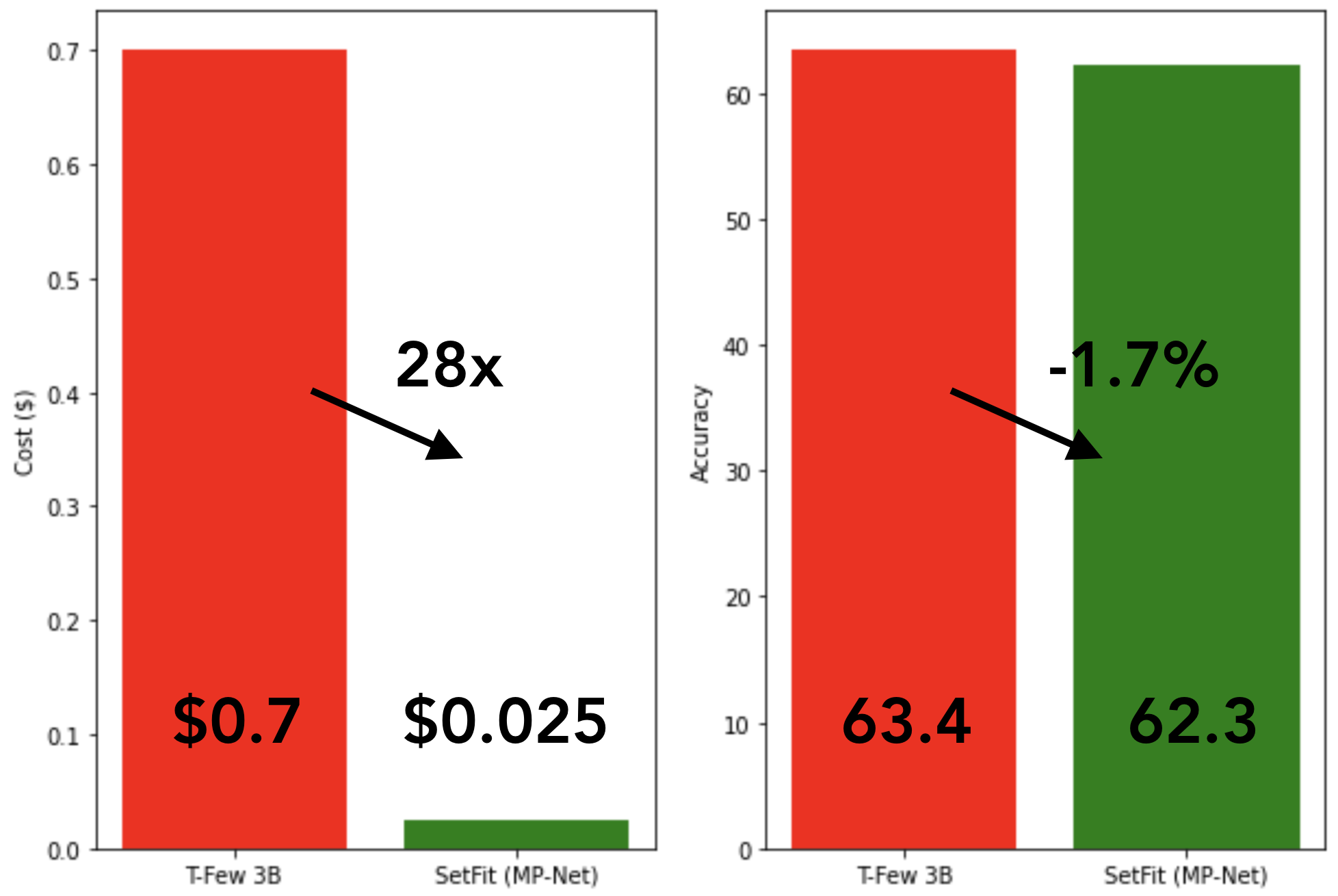 Since SetFit achieves high accuracy with relatively small models, it's blazing fast to train and at much lower cost. For instance, training SetFit on an NVIDIA V100 with 8 labeled examples takes just 30 seconds, at a cost of $0.025. By comparison, training T-Few 3B requires an NVIDIA A100 and takes 11 minutes, at a cost of around $0.7 for the same experiment - a factor of 28x more. In fact, SetFit can run on a single GPU like the ones found on Google Colab and you can even train SetFit on CPU in just a few minutes! As shown in the figure above, SetFit's speed-up comes with comparable model performance. Similar gains are also achieved for inference and distilling the SetFit model can bring speed-ups of 123x 🤯.