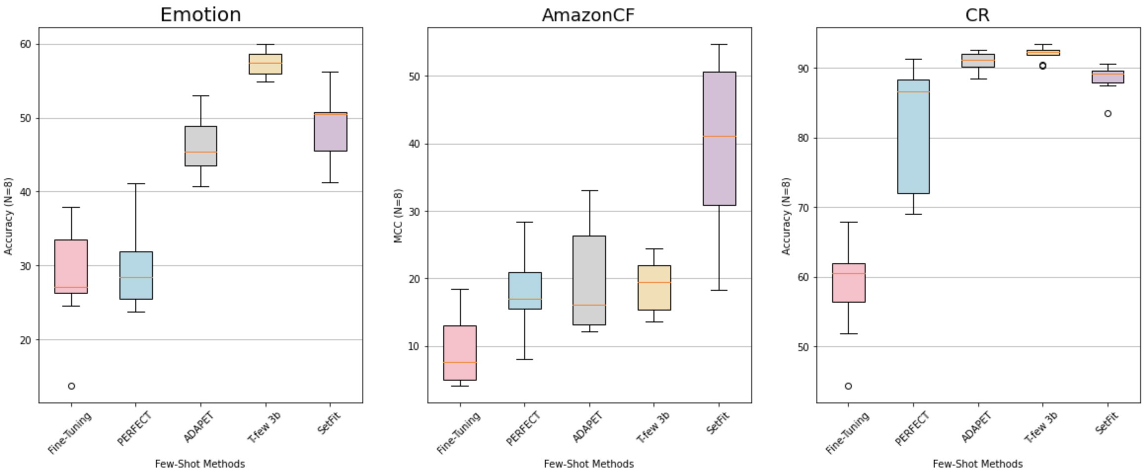 On other datasets, SetFit shows robustness across a variety of tasks. As shown in the figure below, with just 8 examples per class, it typically outperforms PERFECT, ADAPET and fine-tuned vanilla transformers. SetFit also achieves comparable results to T-Few 3B, despite being prompt-free and 27 times smaller.