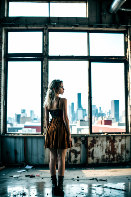 - photograph, cinematic color grading, 1girl, woman, beautiful, Industrial loft with skyline view in a empty fantasy topia outside of time, masterpiece