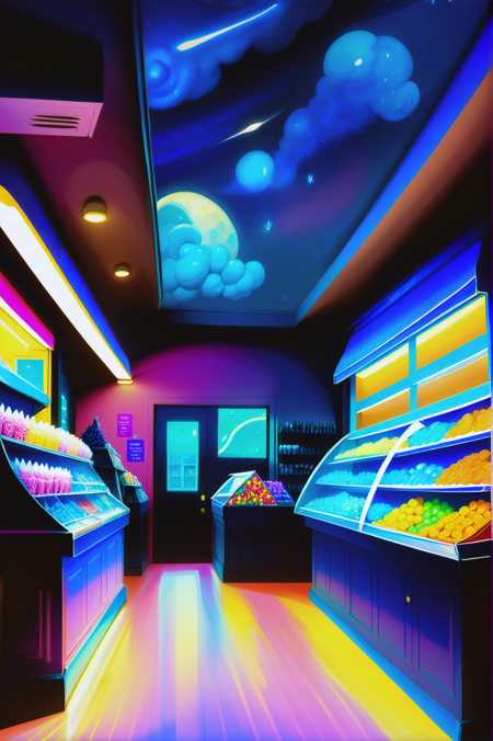 - text: 'digital painting, vivid midnight, dark sky, brightly lit interior, in a harrowing candy shop '