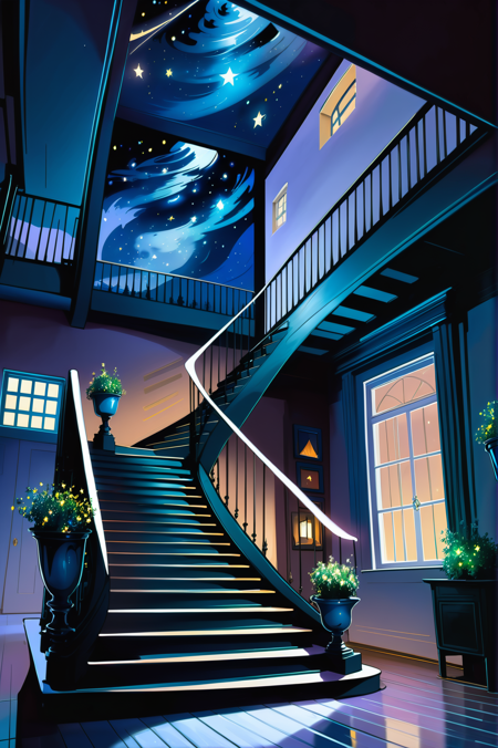 - text: 'digital painting, magical starry sky, dark sky, well-lit interior, in a Breezy staircase '