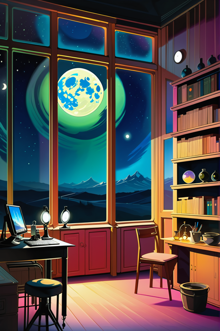 - text: 'digital painting, vivid full moon night, dark sky, warmly lit interior, in a Dry Aurora borealis observatory '