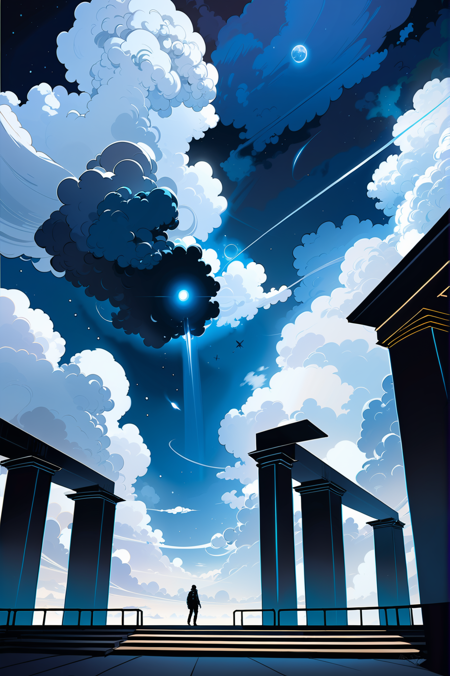 - text: 'digital painting, cosmic midnight, dark sky, morning, blue sky, clouds, architecture, "at the Monochromatic far-future Apparatus"'