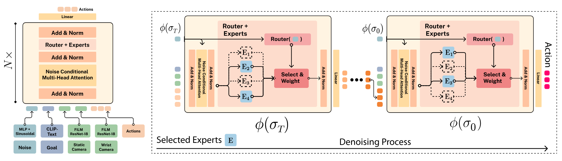 This model implements a Mixture of Diffusion Experts architecture for robotic manipulation, combining transformer-based backbone with noise-only expert routing. For faster inference, we can precache the chosen expert for each timestep to reduce computation time.