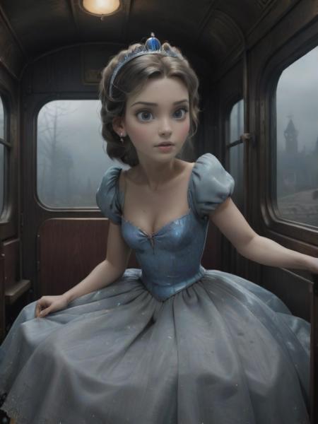 - Horror-themed cinderella in train , . Eerie, unsettling, dark, spooky, suspenseful, grim, highly detailed