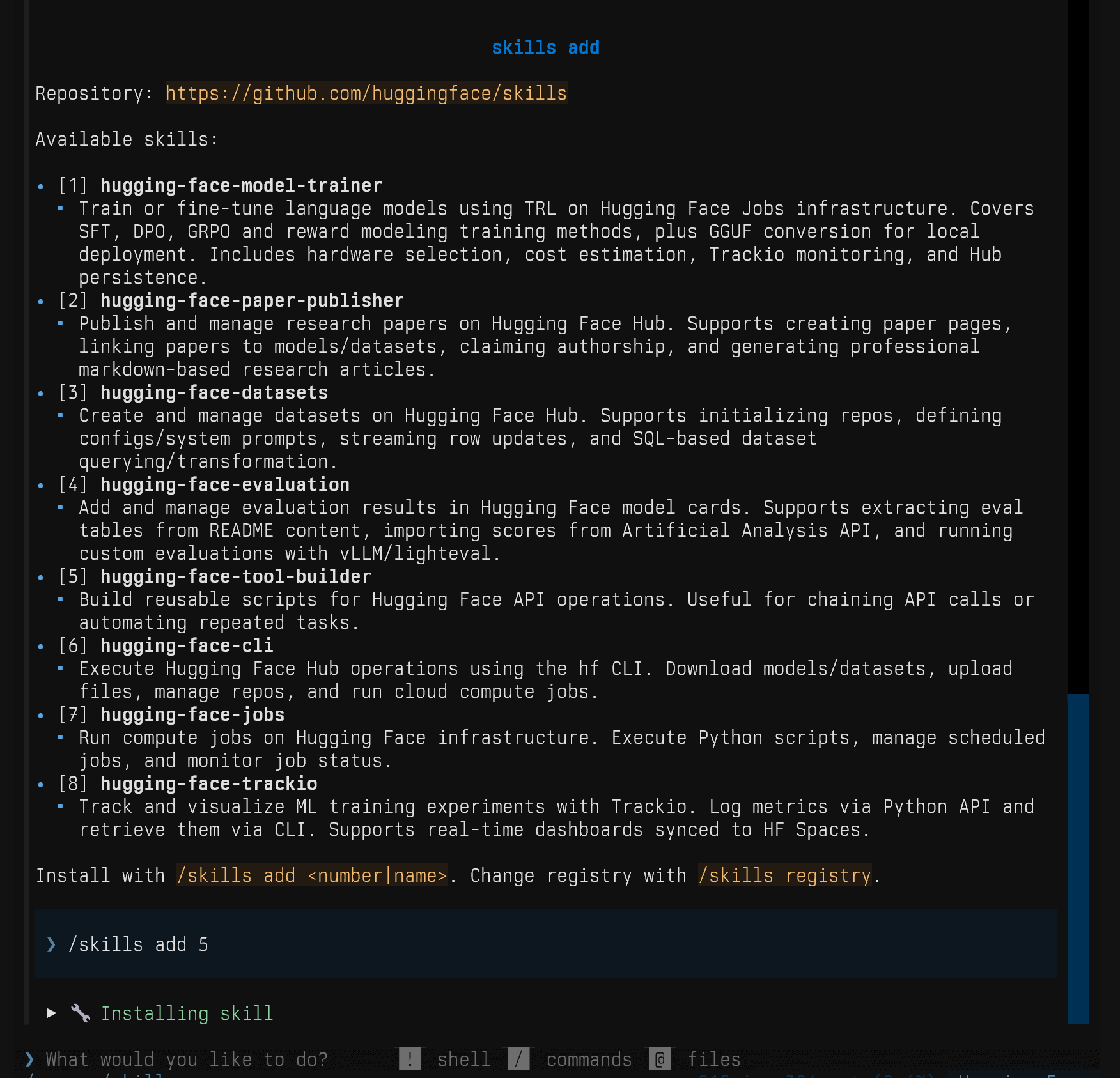 Install and manage agent skills from the Hugging Face Skills repository with the /skills command:
